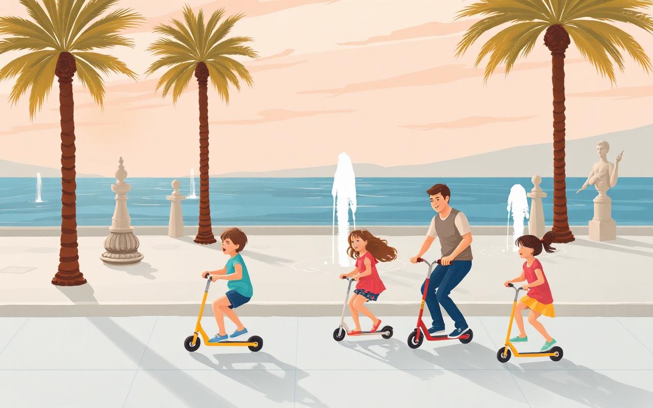 The single best free family asset in the city. A flat, 1km stroller-friendly seafront promenade lined with palms and sculptures, with three large playgrounds along its length and the marina at its southern end. Splash fountains in summer, sunset views year-round, and a flat surface that's brilliant for first bikes and scooters.